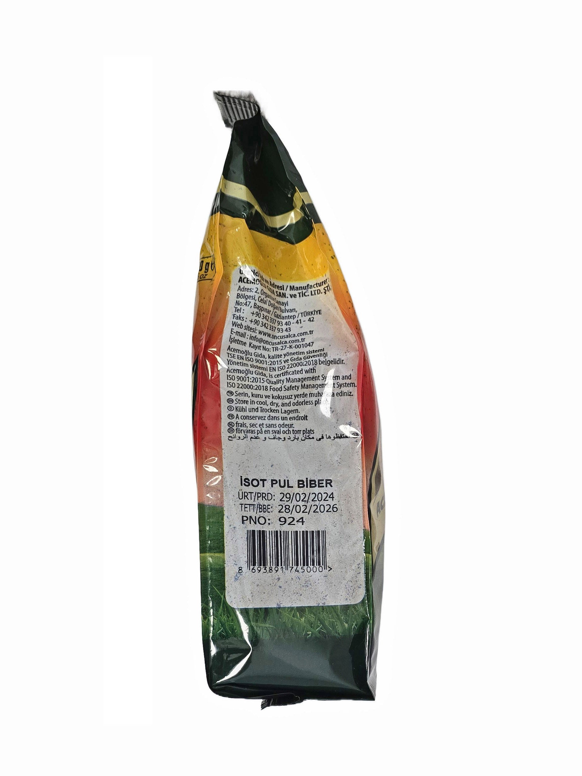 Isot hot pepper flakes crushed ( 500 g) contain both the dried flesh of the pepper and the seeds. Both are cured and lightly toasted to create a smoky and spicy pepper flake. These pepper flakes provide a medium all-purpose heat – use on pizza, pasta, baked potatoes, macaroni and cheese, soups, salads, grilled meats and nearly everything else. Crushed Red Pepper is commonly used on pizza and pasta but can be a great addition to many recipes where slight heat is required. Sold Individually.