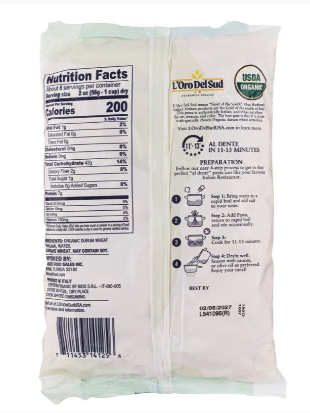 L'Oro del Sud Rigatoni (Individual package) is a premium, Italian-made pasta known for its quality and simplicity. It's crafted from 100% durum wheat semolina and water, with no additives or chemical preservatives, making it a minimally processed and wholesome choice. The pasta is vegan, non-GMO, and kosher certified. It's a versatile pasta shape, with wide, hollow tubes and ridges, that holds sauces well. Sold Individually.