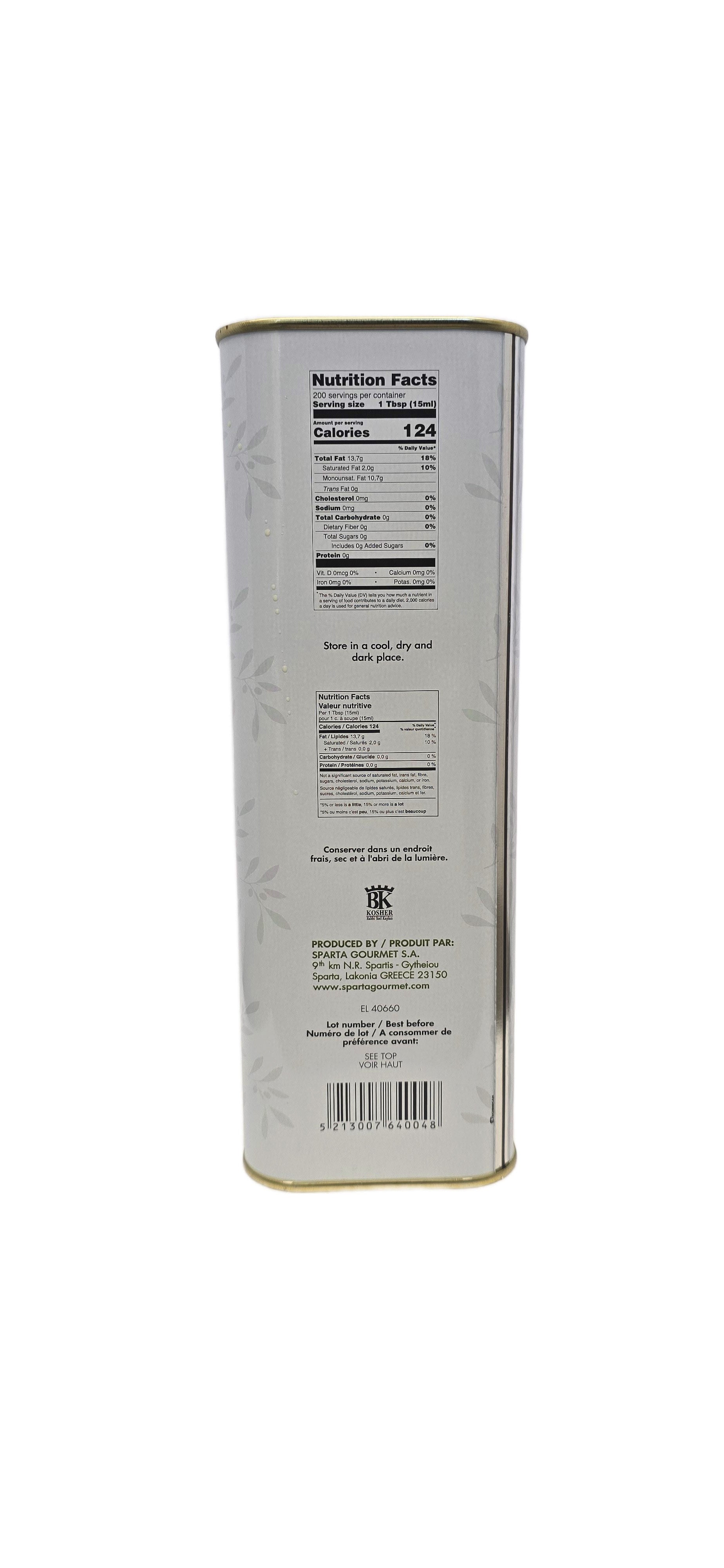 Sparta Gourmet Extra Virgin Olive Oil in a 3-liter tin is a premium Greek olive oil known for its rich, flavorful taste and cold-pressed quality. It's a versatile oil, suitable for drizzling on salads, enhancing cooked dishes, or using as a healthier alternative to butter. The oil is made from high-quality olives, is cholesterol-free, and offers a smooth, fruity, and balanced flavor. Sold Individually.