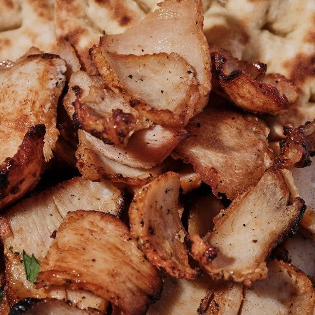 The Traditional Chicken Cone is the "Traditional Chicken Cone Megas Yeeros" refers to a type of gyro, a popular Greek dish, made with seasoned chicken that is stacked on a vertical rotisserie (the "cone") and shaved off for serving. Each cone sold individually.