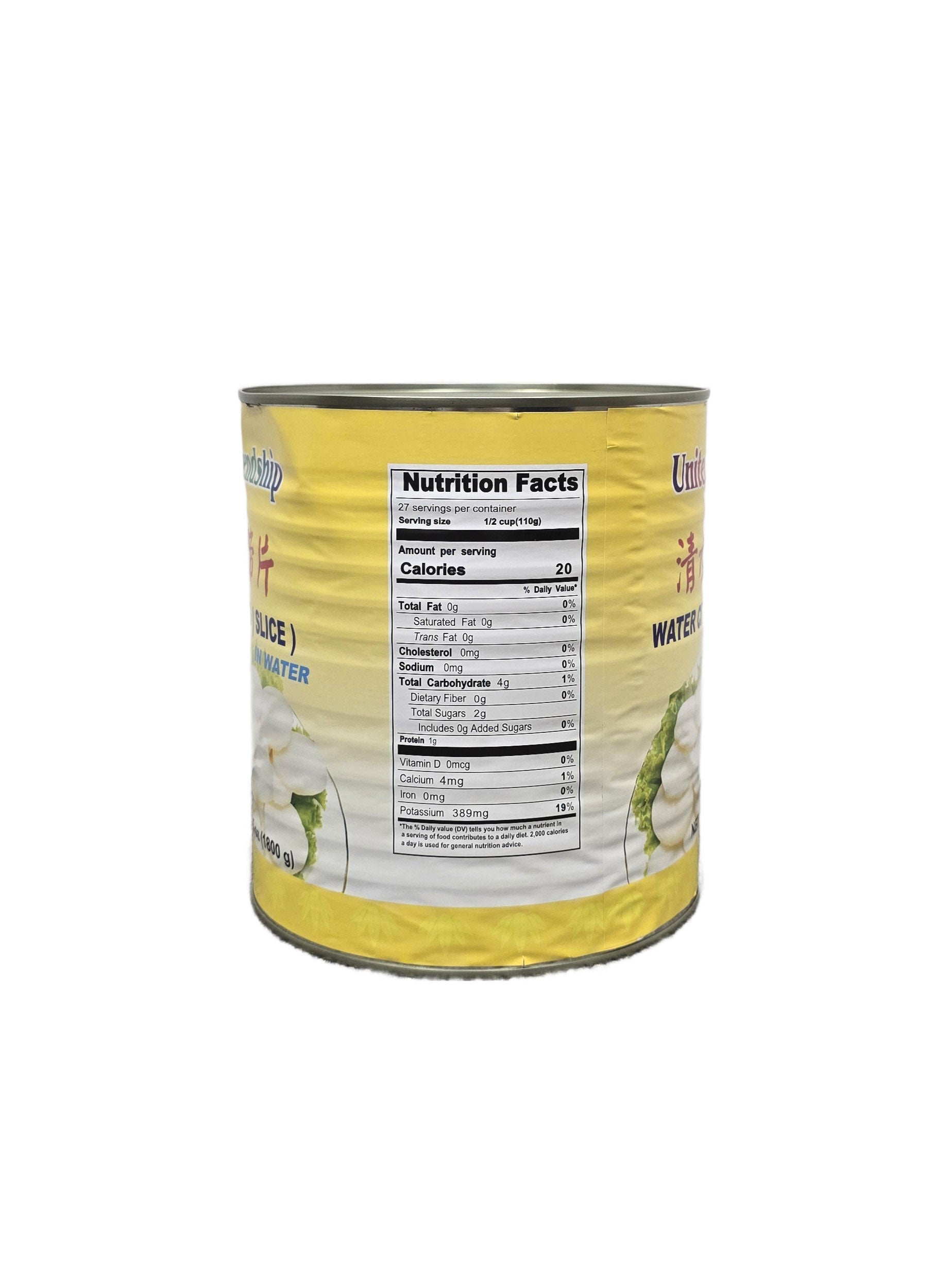 United Friendship Water Chestnuts Sliced in Water (Canned) (63.5 oz) are a popular ingredient known for their mild, slightly sweet flavor and crisp, crunchy texture. They are often used in Asian cuisine, particularly in stir-fries, salads, and soups. The slices are typically pre-cut for convenience, ready to be added to various dishes without further preparation. Sold Individually.